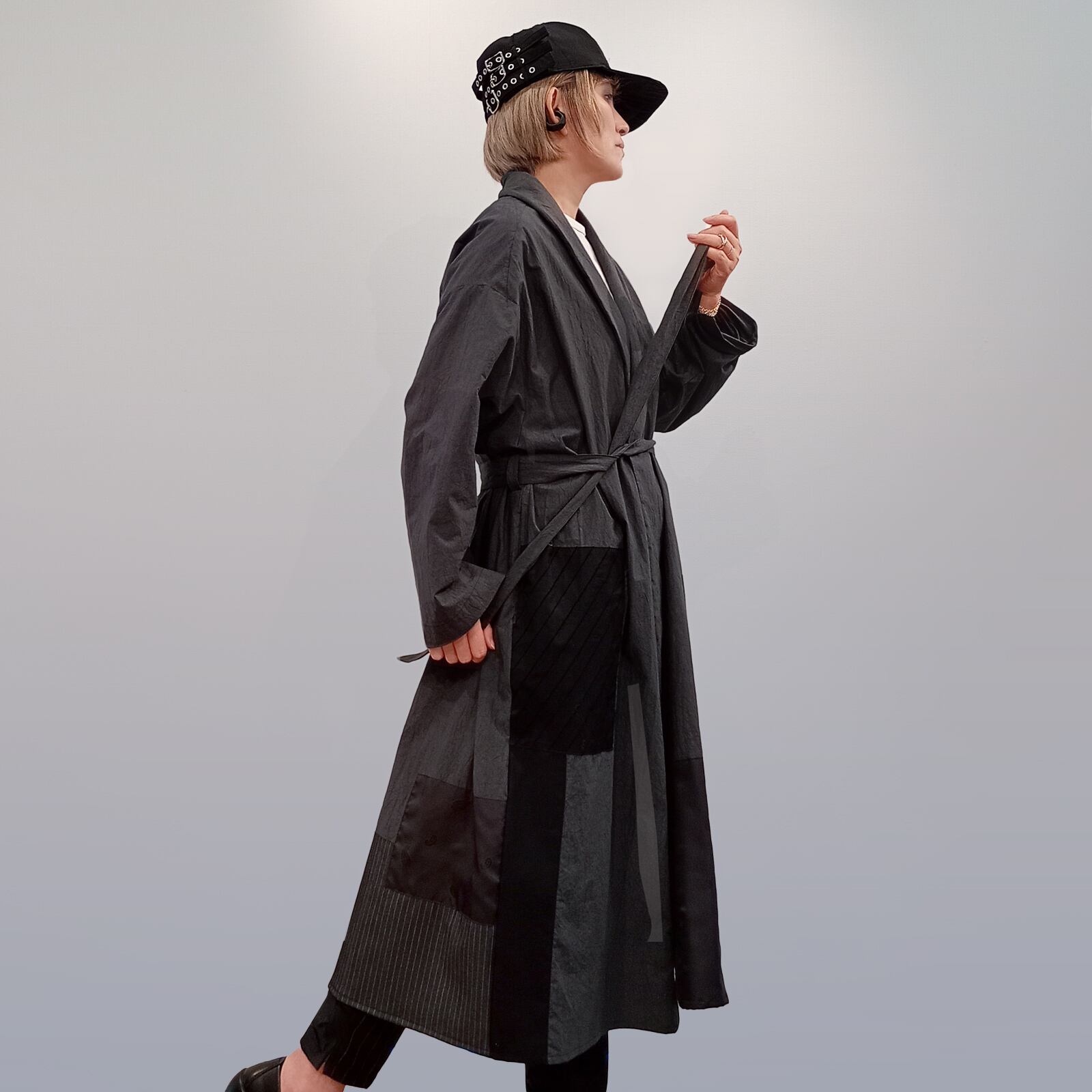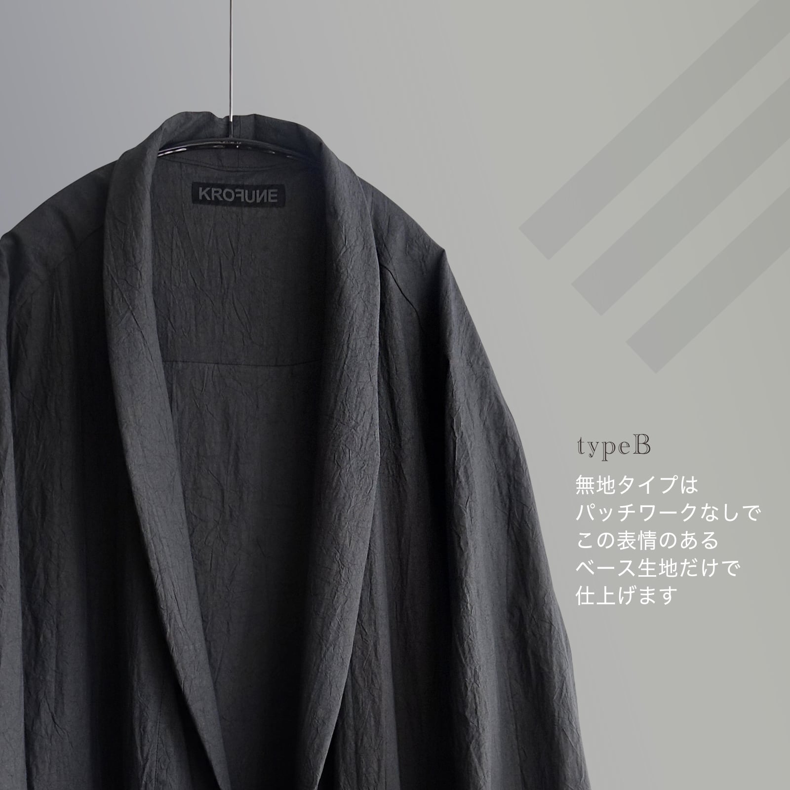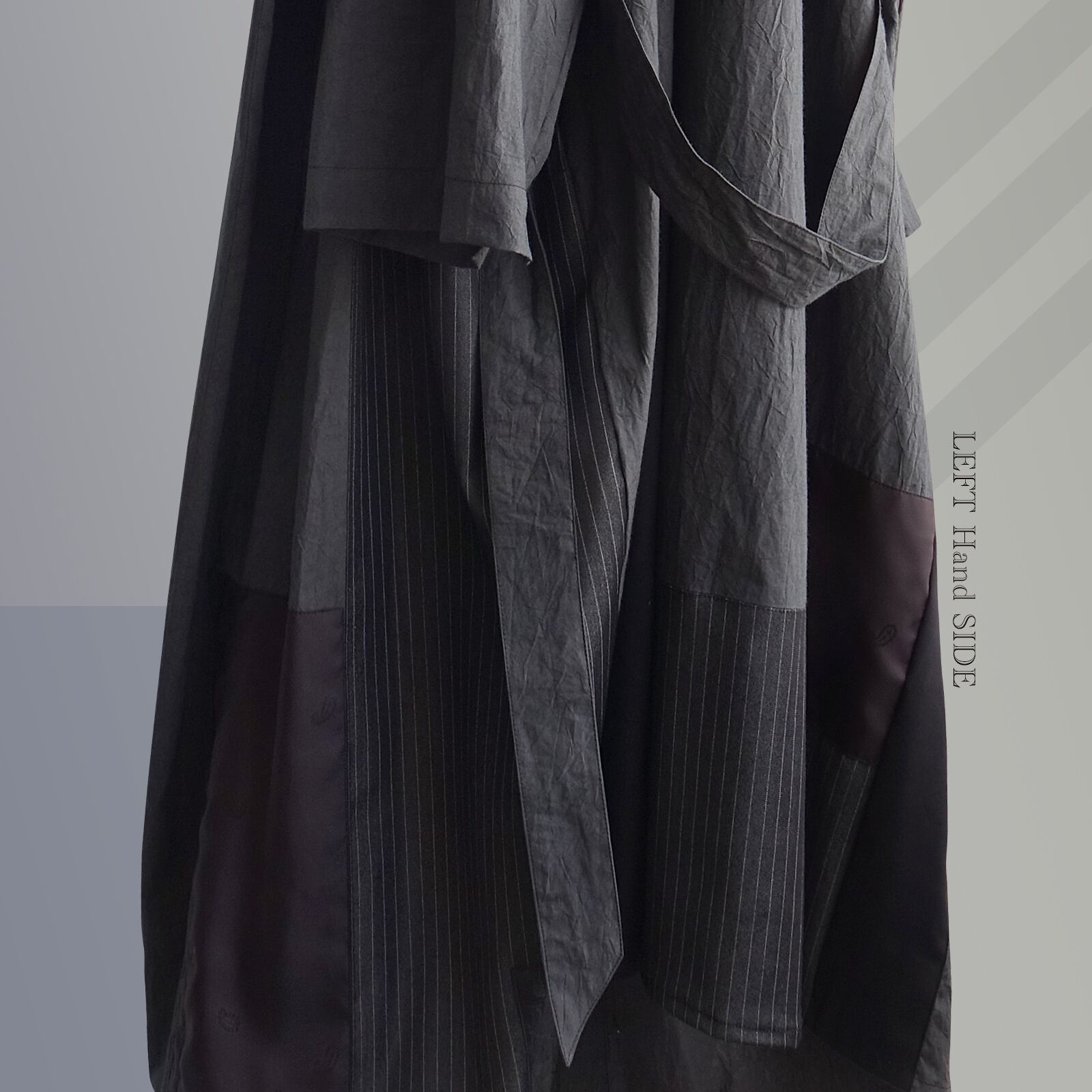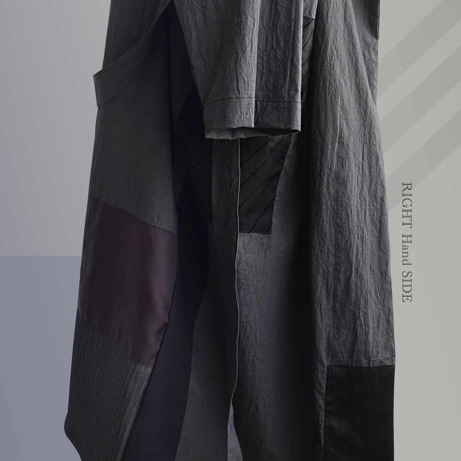 新素材のシワ加工されたコットンを軸に、様々な生地を合わせてお作りしたガウンです。
