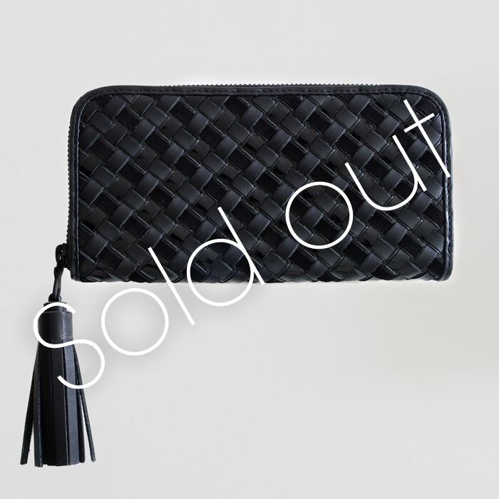 ヌバックやキップ、ガラス加工の革などを様々な質感の黒革を組み合わせました。光のあたり方で つややかに見えたり、マットに見えたり...緻密な革細工は強くもあり美しくもある。せっかくなのでタッセル付きで持ちたい長財布です。